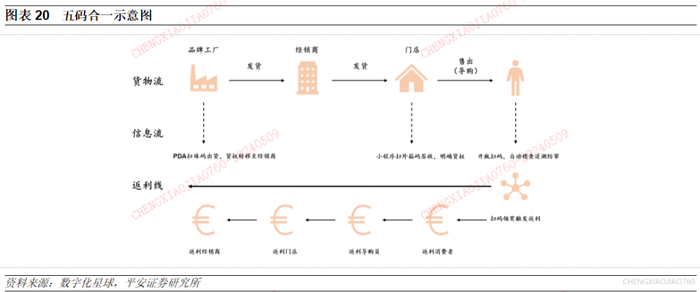 扫码红包基于物流信息,合理分配利润链条。据酒业家,“五码合一”即“盖内码”、“盖外码”、“盒码”、“箱码”、“中转箱码”五码关联,通过数字化手段辅助控盘,合理分配渠道利润,基于“货物流”优化“渠道关系”。具体来看,在“五码合一”的模式下,酒企掌握物流开瓶的核心数据与经营主动权,经销商入库扫码后,再分销到终端店进行二次扫码。而消费者在购买产品后开瓶扫码,就可以获得金额不等的红包,相应的终端门店与经销商同样能够获得一定的现金返利或积分奖励。
