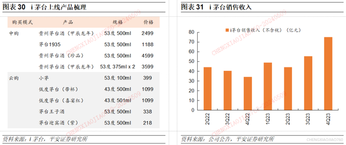茅台直营布局领先,i茅台快速放量。贵州茅台作为行业龙头,品牌力影响力强,在直营渠道的布局上亦处于领先地位。i茅台于2022年3月31日试运行,当时共上线虎年生肖(500ml)、虎年生肖(376ml x2)、珍品茅台、茅台1935等四款产品,均采取预约申购方式;2022年5月19日,i茅台正式运营,新增上线飞天53度(100ml)、飞天43度(带杯)、飞天43度(喜宴红)、金王子、紫迎宾等五款产品,采用云购模式无需申请。据公司公告,截至2023年末,i茅台注册用户数超5300万,日活用户超480万,2023年实现销售收入(不含税)224亿元,同比增长88%,占到白酒收入整体的16.4%,同比+6.8pct。