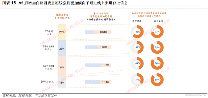 白酒消费代际逐渐更替,Z世代更倾向于线上消费。据中国酒业协会与腾讯联合发布的《2023年中国白酒行业消费白皮书》,95后白酒消费者占比相对较低约18%,但未来增加白酒消费的意愿较强,约83%的白酒增量人群在95年后出生。而Z世代作为互联网的原住民,更加倾向于通过线上渠道了解信息,只有37%的Z世代消费者通过线下渠道了解白酒,较75年出生人群的63%低26pct。