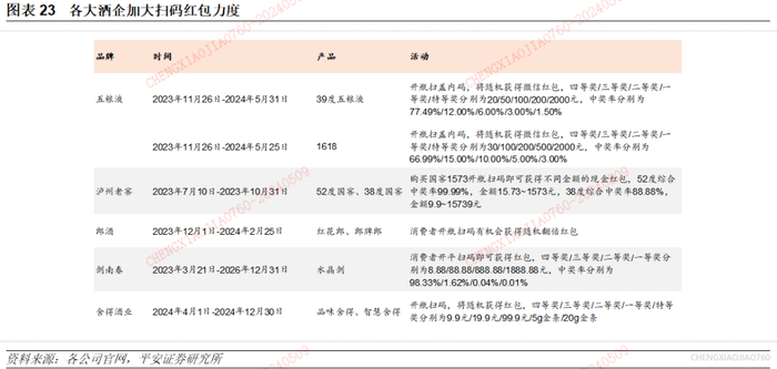 扫码开瓶政策常态化,各大酒厂加码布局。近年来宏观压力下,白酒行业消费内卷,促动销、去库存成为酒厂的首要工作,扫码红包亦逐渐常态化,开瓶激励、红包力度和中奖概率都较大。如2024年春节期间,郎酒进一步加大红包力度,消费者开瓶扫码红花郎、郎牌郎即有机会获得随机翻倍红包;国窖1573春节期间购买52度、38度国窖1573二维码产品即有机会获得再来一瓶;五粮液1618、39度五粮液扫码中奖率达99.99%,最大金额达2000元。