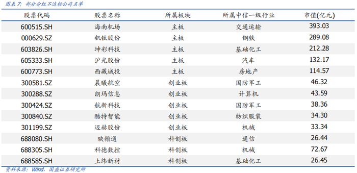 将分红金额和回购金额对应年度加总求得个股年度分红总金额,最终按照图表6中不同板块的规则筛选得到分红不达标的股票名单。