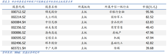 交易类退市规则修订后,按照截至2024年4月30日行情数据,主板退市的市值要求收紧后仅两家公司触发交易类退市规则,且两家公司2023年年报已触发财务类退市规则。北交所股票新增的成交量要求对退市股票数量暂无影响。图表2展示了各板块在修订前后不满足条件的股票数量变动。图表3展示了部分在财务类退市新规下因营收不足而可能触发财务类退市的主板股票名单。