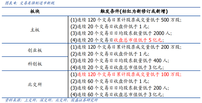 交易类退市规则主要修订了总市值相关指标,主板上市公司的市值退市指标由3亿元提升至5亿元,进一步加快市值过小的微盘股退市节奏。此外,北交所新增成交量过低股票的退市指标,低流动性股票也将加速出清。图表4展示了修订后新规的具体内容。