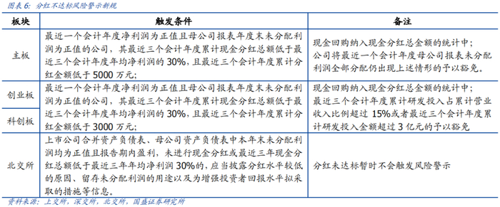 新规另一亮点在于豁免制度。创业板、科创板上市公司中,允许对研发投入占比较高或研发支出金额较大、且未满足分红要求的公司不实施ST。图表6展示了分红不达标风险警示新规的具体细则。