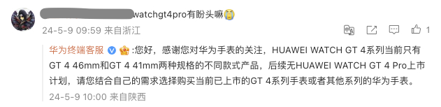 5月9日,华为终端BG首席执行官何刚发布微博预热,华为WATCH FIT 3手表将于 5月15日在国内发布。有网友在评论区询问“WATCH GT 4 Pro有盼头嘛”,@华为终端客服 回复:HUAWEI WATCH GT 4系列当前只有GT 4 46mm和GT 4 41mm两种规格的不同款式产品,后续无HUAWEI WATCH GT 4 Pro上市计划。