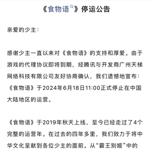 4月17日,《食物语》官方发布了一则公告,称由于游戏的代理协议即将到期,《食物语》将于2024年6月18日11:00正式停止在中国大陆地区的运营。该公告表示:“除法律法规有特殊规定或腾讯与您签署的协议另有约定外,我们将依据《个人信息保护法》在游戏服务器关闭后对您的账号数据及角色资料等信息进行删除。”