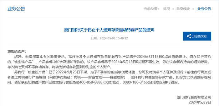 今日下午,厦门银行在官网发布了关于停止个人通知存款自动转存产品的通知。厦门银行称,为贯彻落实有关政策要求,该行涉及个人通知存款自动转存的产品将于2024年5月15日0点起自动停止。“您在我行签约的“钱生钱产品”,产品套餐中如涉及通知存款的,该产品套餐将于2024年5月15日0点起不再生效,您在该套餐内持有的通知存款,存入满七天后不再自动转存,将转为活期存款回到您对应的个人账户。”