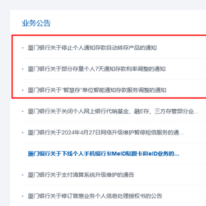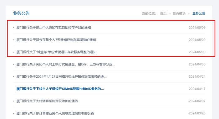 除了叫停针对个人的智能通知存款产品,厦门银行本次也宣布下架对公智能通知存款服务。厦门银行表示,为贯彻落实有关政策的要求,该行“智慧存”单位智能通知存款将于2024年5月14日正式下架,存量业务自动终止,存续中的资金将返还至投资者的签约活期账户。
