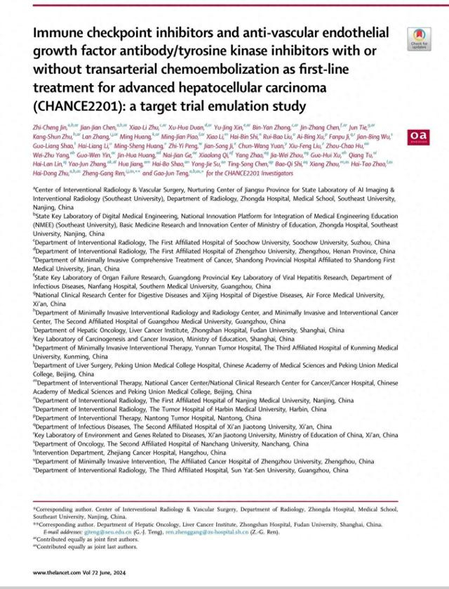扬子晚报讯(通讯员 程守勤 记者 王梦航)5月6日,由中国科学院院士、东南大学附属中大医院院长滕皋军教授,复旦大学附属中山医院任正刚教授牵头开展的CHANCE(中国肝癌临床研究联盟)2201项目“靶免药物联合/不联合肝动脉化疗栓塞术(TACE)一线治疗晚期肝细胞癌的多中心、真实世界研究”,其成果在线发表于《柳叶刀(Lancet)》子刊《电子临床医学(eClinicalMedicine)》。研究结果显示,肝动脉化疗栓塞术(TACE)联合靶免治疗晚期肝细胞癌,显著地优于单纯的靶免药物治疗。这也是滕皋军院士团队在TACE联合靶免药物治疗与单独TACE在中晚期肝癌中的疗效比较取得成果之后的又一项最新进展,为晚期肝癌临床治疗再添新证。