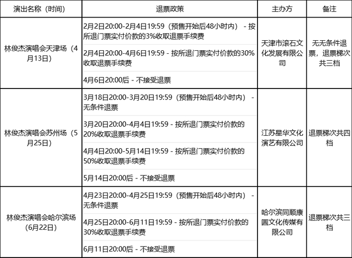 同样是林俊杰演唱会,哈尔滨6月22日场次的演唱会,退票按时间分3个梯次:无条件退票、门票价格30%和不支持退票。