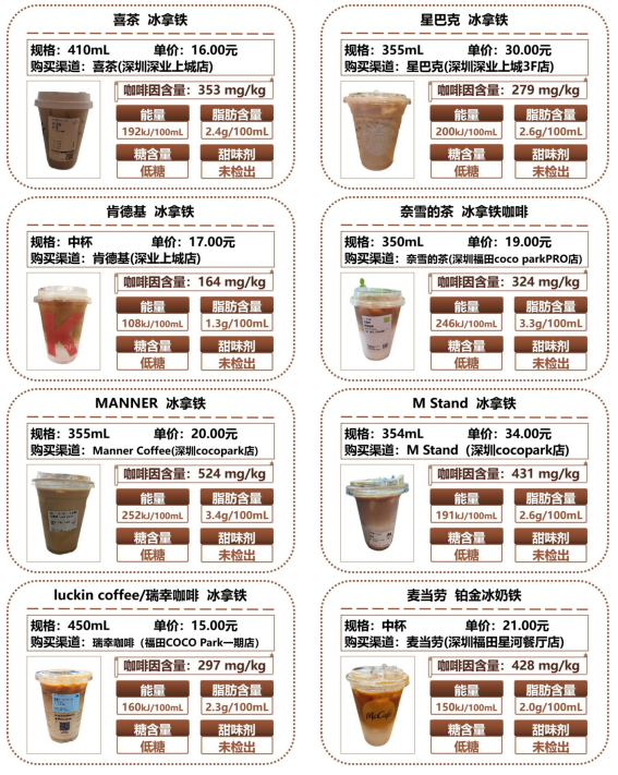 2023年11月至今年2月,深圳市消委会对市面上售销的24款现制咖啡饮品开展比较试验。
