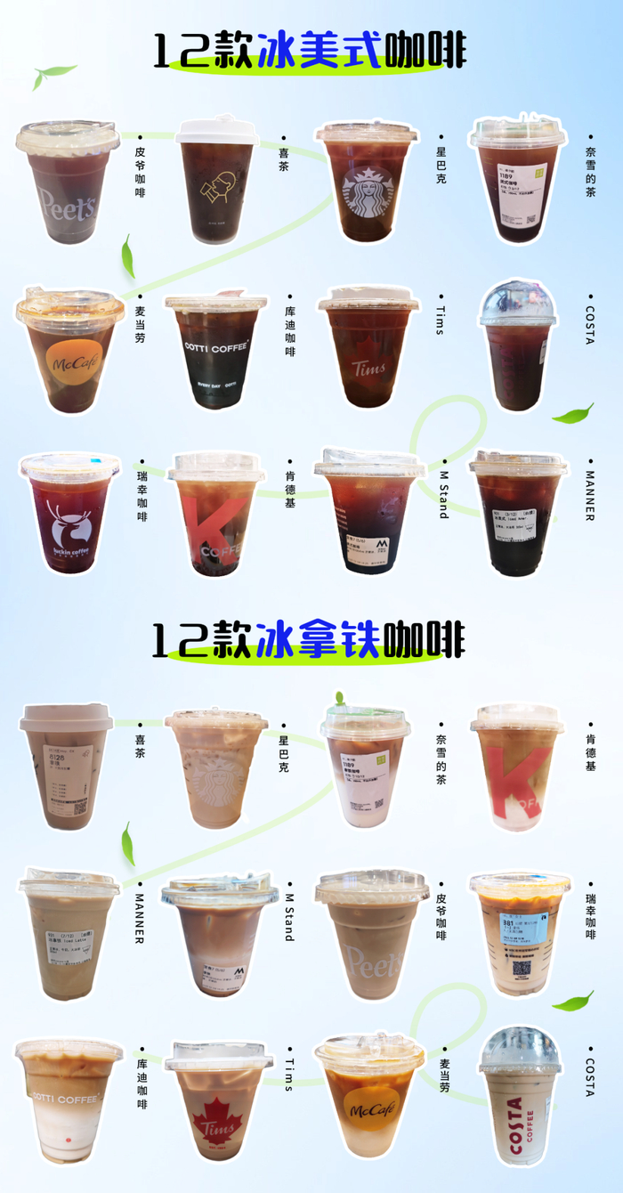 样品数量:美式咖啡和拿铁咖啡各12款样品,24款现制冰咖啡样品均不另外加糖。