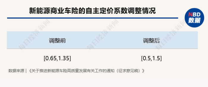 近期,金融监管总局财险司已下发《关于推进新能源车险高质量发展有关工作的通知(征求意见稿)》,为提升市场经营主体的定价能力,《征求意见稿》提出,新能源商业车险自主定价系数范围按照[0.5,1.5]执行,新能源商业车险的自主定价系数范围已经向燃油车看齐。