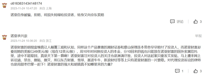 另一位投资人则表示,“诺亚自身被骗,拒赔,将损失转嫁给投资者,转身又向京东索赔”。