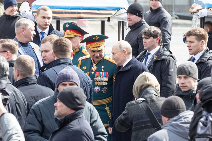 ↑5月9日,在俄罗斯首都莫斯科,俄罗斯总统普京在阅兵结束后与俄罗斯国防部长绍伊古交谈。