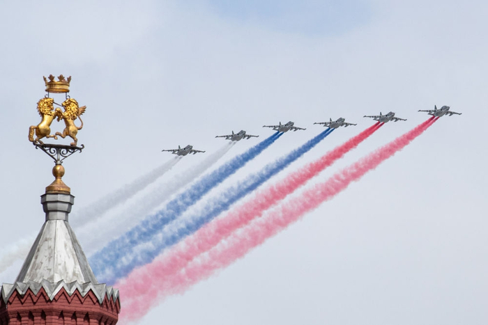 ↑5月9日,在俄罗斯首都莫斯科,苏-25攻击机编队在红场上空飞过。