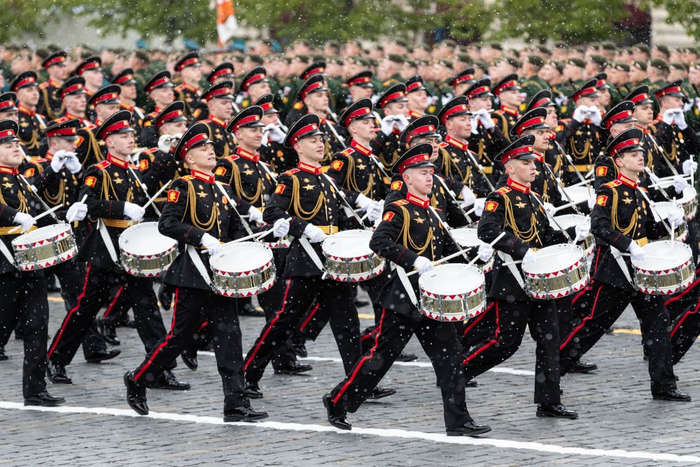 ↑5月9日,在俄罗斯首都莫斯科,鼓手编队走过红场。