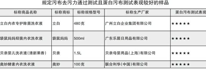 比较试验还发现,13款宣称内衣专用或婴幼儿专用的样品,对碳黑油污渍和皮脂污渍的去污力与普通型样品无明显差别,而对蛋白污渍(如鸡蛋、牛奶、尿渍、血渍等)的去污力要优于普通型样品。其中,4款内衣专用或婴幼儿专用的样品对蛋白污布的去污力表现较好,标称由广州立白企业集团有限公司生产的立白内衣专护除菌洗衣液、标称由贝亲母婴用品(上海)有限公司生产的贝亲婴儿洗衣液(清新果香)等样品蛋白污布测试表现均获得5星。