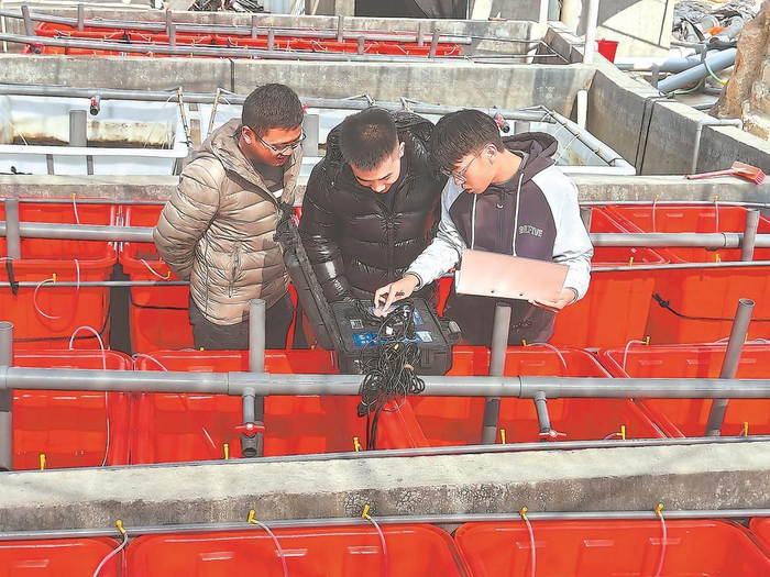 福州墨尔本理工职业学院“鲍之家”团队在观测鲍鱼养殖数据。