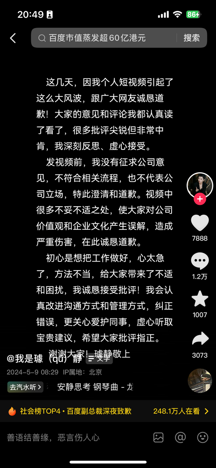 5月以来,简介为百度副总裁璩静的社交媒体账号连发多条争议性短视频内容,阅读量过亿。其中“员工闹分手提离职我秒批”登上微博热搜,她称和员工只是雇佣关系,没有义务去了解其个人情况;如果员工拒绝和她连续出差50天,“升职加薪的时候不要来找我”等。目前其个人抖音账号争议内容已被全部清空,只留下了一条道歉的内容。