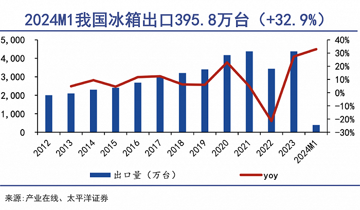 受益于全球消费复苏、海运价格回落等因素,冰箱出口景气度持续升高。海关总署数据显示,今年一季度,我国冰箱出口额同比大增33.2%,出口量同比增长34.4%。