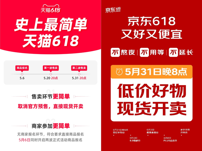 根据天猫5月6日公布的规则,取消预售后,今年天猫“618”共有两波现货售卖期,第一波自5月20日晚8点开始,第二波自5月31日晚8点开始。此外,天猫还特别强调,此次也将简化商家报名参加环节,无商家报名环节,满足条件的商家直接进行商品报名即可。