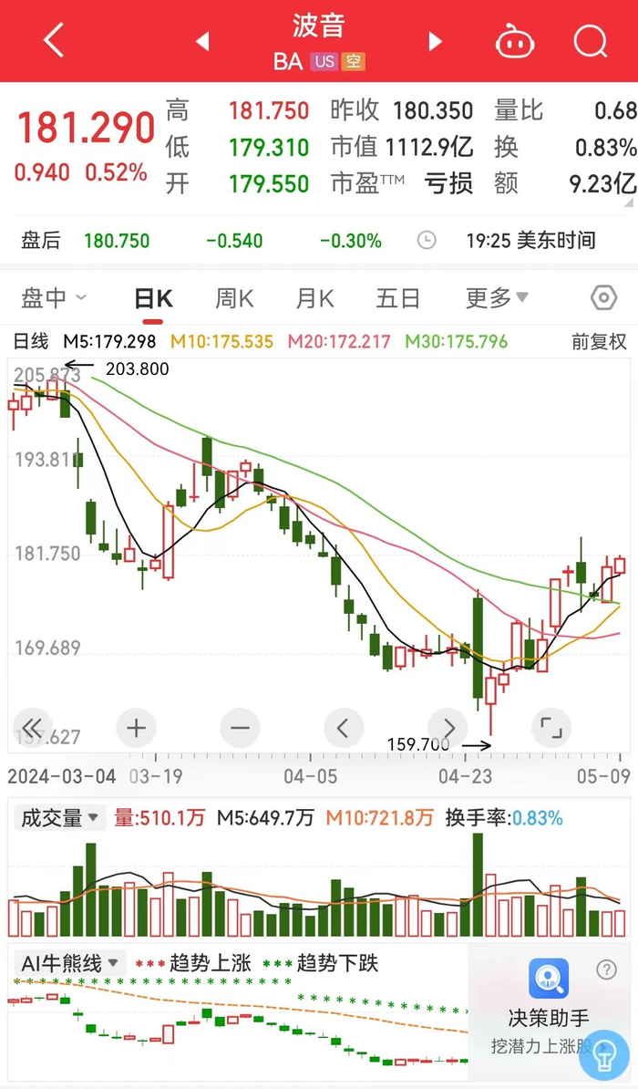截至5月9日收盘,波音(BA)报181.29美元,涨幅0.52%,市值1112.9亿美元。