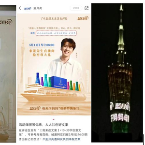 5月7日晚间,有广东用户拍到蓝月亮在广州塔塔身投放的母亲节祝福广告,投放字幕为祝天下妈妈母亲节快乐。