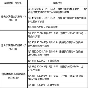 同样是林俊杰演唱会,哈尔滨6月22日场次的演唱会,退票按时间分3个梯次:无条件退票、门票价格30%和不支持退票。
