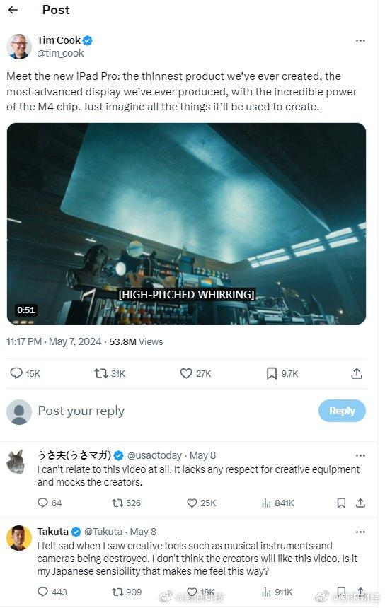 声明称:“创造力是我们苹果公司的 DNA,设计能够为全世界创意人士提供支持的产品对我们来说非常重要。我们的目标是鼓励用户多元化表达,通过 iPad 将其想法变为现实。而这段视频没有达到这个目标,我们很抱歉。”还表示不会按计划在电视上播放。