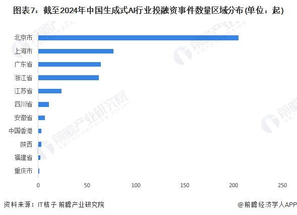 从生成式AI行业的企业融资区域来看,目前北京市的融资事件数量最多,截至2024年4月,北京市融资事件数量超过200起,成为全国生成式AI融资热度最高的城市,远超排名第二的上海市。上海市生成式AI行业融资融事件数量接近80起。广东省和浙江省生成式AI融资事件数量约60余起。