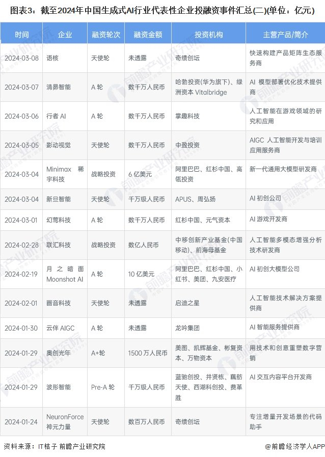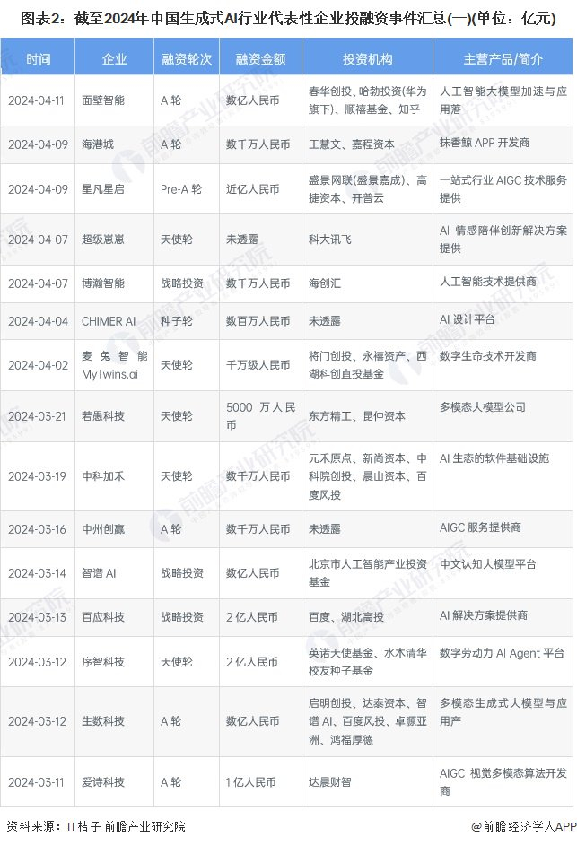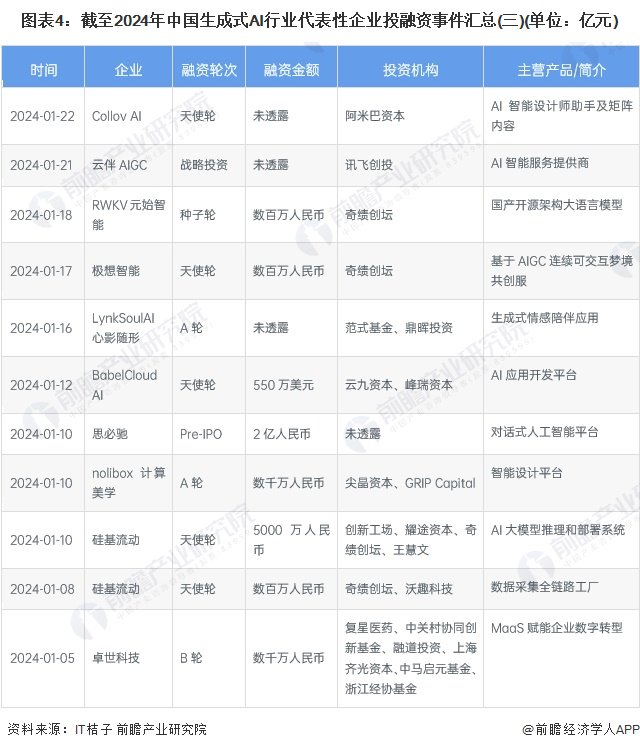 截至2024年4月,中国生成式AI行业代表性企业投融资事件较多,以下汇总2024年以来的事件情况: