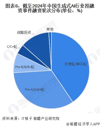 从中国生成式AI行业投融资事件轮次分布情况来看,大多数企业通过天使轮/种子轮或Pre-A/A/A+轮获取融资。在已统计到的生成式AI企业融资事件中,天使轮/种子轮融资事件占比约为41%,Pre-A/A/A+轮事件数量占比约34%。整体来看,生成式AI行业处于快速成长期,融资热度高,大多数企业在进行天使轮融资。