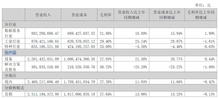 从财务数据来看,申菱环境在2023年实现了设备与解决方案及服务的营业收入分别为22.01亿元和3.02亿元,占总营业收入的比例分别为87.66%和12.02%。