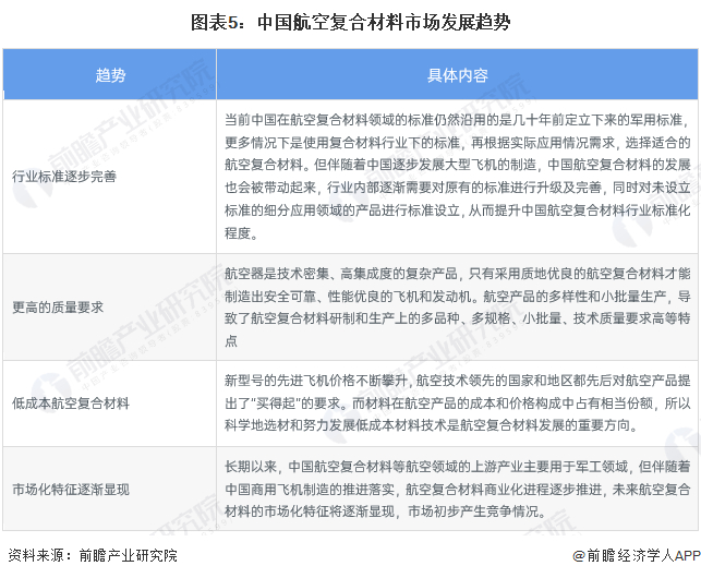 中国航空复合材料行业发展总体为行业标准逐步完善、更高的质量要求、低成本航空复合材料和市场化特征逐渐显现,行业发展趋势与分析具体如下: