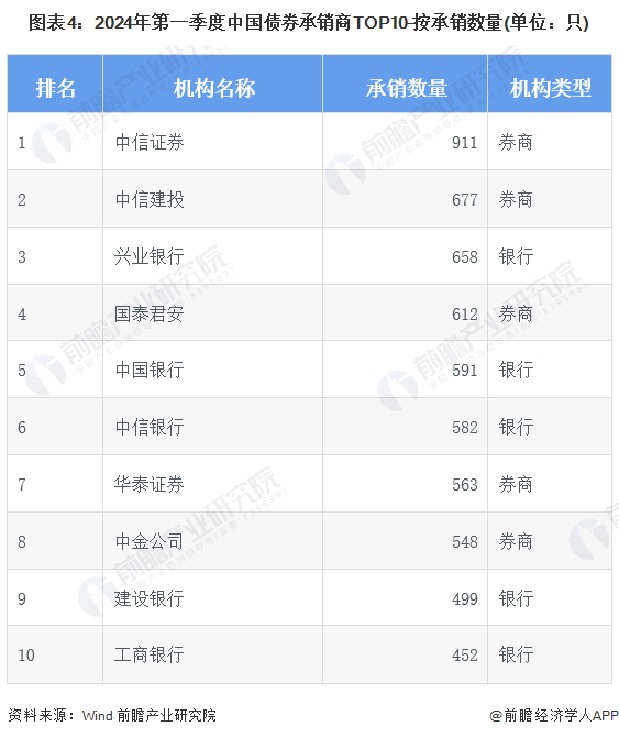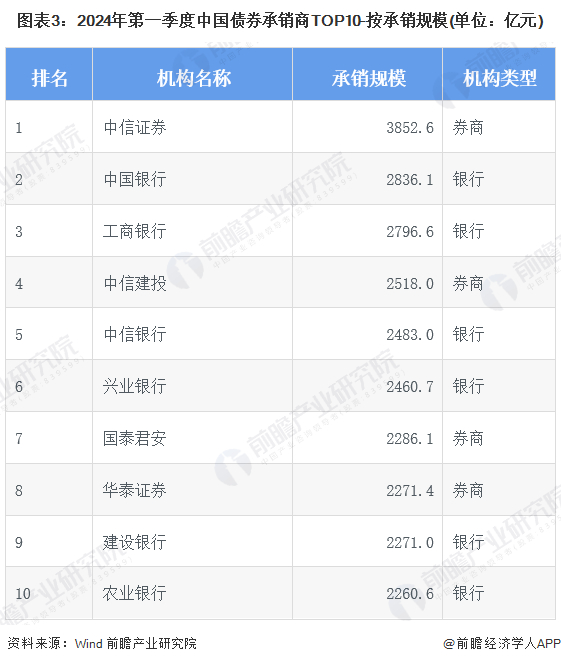 据Wind统计,2024年第一季度,债券承销规模最大的机构是中信证券,承销规模达到2865.5亿元;其次,中国银行和工商银行分别位居第二和第三名,承销规模分别为2836.1亿元和2796.6亿元。在前十名中,上榜的银行机构有6家,上榜的券商有4家。