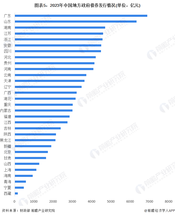 在区域竞争方面,2023年,中国地方政府债券发行规模最大的2个省市是广东和山东,发行规模均在6000亿元以上,分别为6871亿元和6311亿元,而其他省市的发行规模均未超过5000亿元。