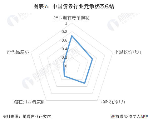 根据以上分析,对各方面的竞争情况进行量化,1代表最大,0代表最小,目前我国债券行业五力竞争总结如下: