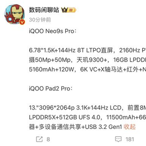 IT之家 5 月 10 日消息,iQOO Neo9S Pro手机及 Pad2 Pro 平板电脑将于本月发布,目前博主@数码闲聊站曝光了系列机型的配置信息,IT之家整理如下: