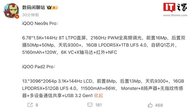iQOO Neo9S Pro 手机 / Pad2 Pro 平板规格曝光,均搭天玑 9300+