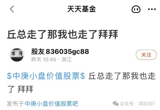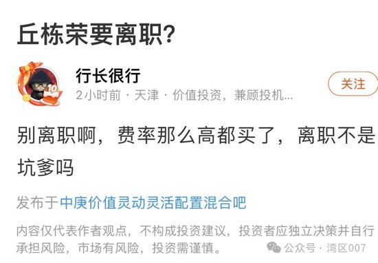 也有人认为,网传的邱栋荣离职,大概率为假消息,毕竟他是中庚基金的顶流,业绩也一直稳扎稳打,但在公募淡化明星基金经理的当下,邱栋荣卸任一款产品还是非常有可能的。