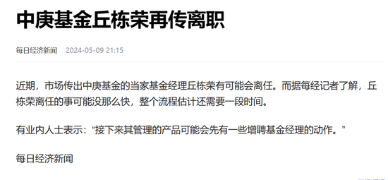 但如果邱栋荣真的如传闻离职,那将是中庚基金不能承受之重,毕竟规模占到中庚基金8成,而且还是首席投资官,第四大股东。