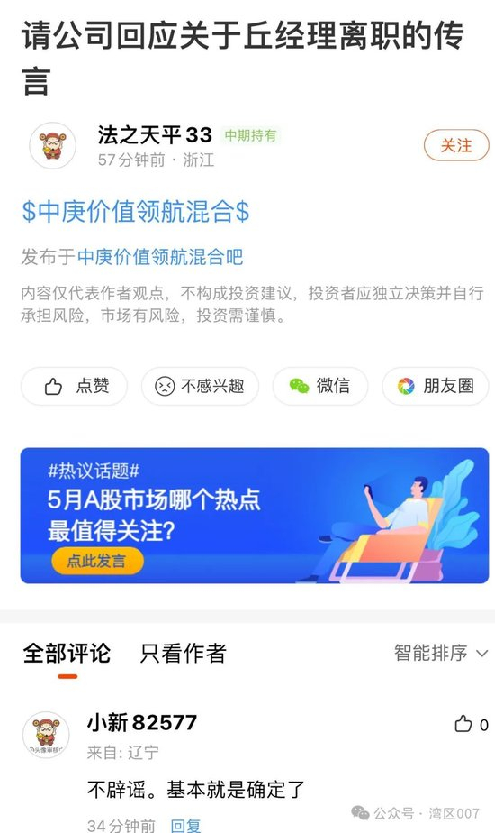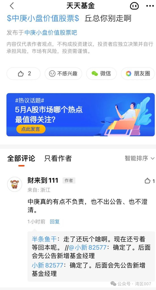 但是现在的局面很糟糕,中庚基金还没有官宣,市场上那个传闻已经是满天飞,这就导致了一个问题: