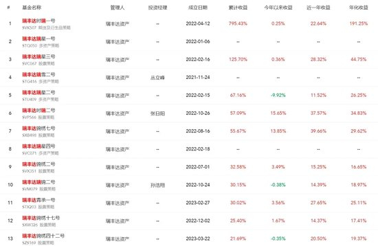 私募排排网信息显示,瑞丰达展示的产品业绩表现相当惊人,年化收益超过15%甚至20%的产品比比皆是。其中最夸张的是瑞丰达时瑞一号,成立于2022年4月,截至4月30日产品净值8.9543,成立来收益795.43%,年化收益191.25%。
