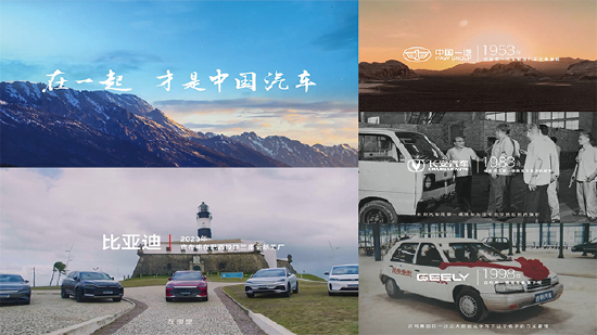 线上,比亚迪发布了一支短片,以‘在一起 才是中国汽车’为主题,顺着中国汽车品牌的诞生脉络,逐一向一汽、东风、长安、上汽、广汽、奇瑞、吉利、长城、小鹏、蔚来等品牌致敬。比亚迪抓住这一品牌里程碑式的高光时刻,跨出品牌视角,将其嵌入中国汽车制造业的行业格局,通过这支短片致敬各大中国汽车品牌,也回溯了各个品牌的关键性节点,表达出一同推动中国汽车发展的决心,点燃了大众的民族情怀。