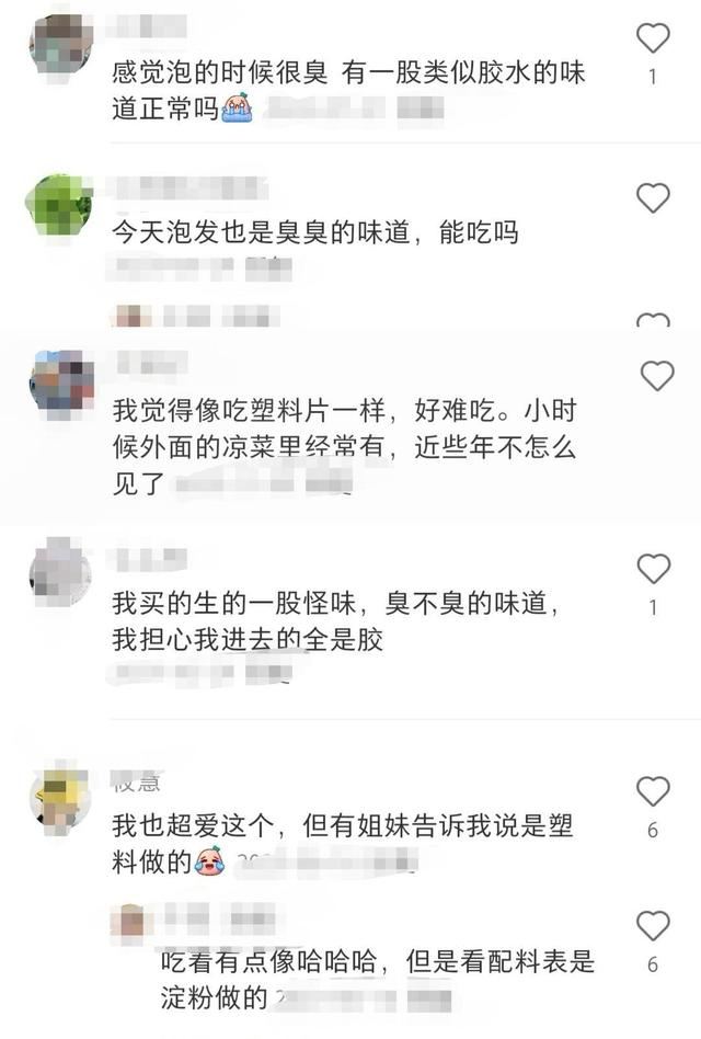 作为“凉菜三巨头”成员的芋头粉和水晶粉条,在做成凉菜之前都是干干的长条,需要用水将其浸泡至软再调味。许多网友发文称,这两种食材用热水浸泡时有股浓烈的塑料味,加上其形状和口感,都让人怀疑它们是塑料制作的。此外,也有人指出,有的龙须菜吃起来也怪怪的。