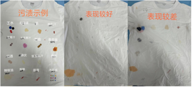 在日常穿着中,衣服弄脏的主要原因是活动过程中沾染到的生活污渍。我们模拟了消费者使用习惯,将16种生活污渍(墨水、咖啡液、茶水、番茄酱、老抽、红酒、橙汁、辣椒油、唇釉、唇膏、水彩笔等)涂抹于白色T恤,进行去除能力测试。