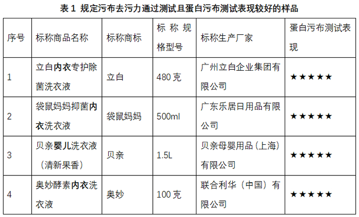 特别一提,13款宣称内衣专用或婴幼儿专用的样品,对碳黑油污渍和皮脂污渍的去污力与普通型样品无明显差别,而对蛋白污渍(如鸡蛋、牛奶、尿渍、血渍等)的去污力要优于普通型样品(均值分别为2.6和1.9),其中4款内衣专用或婴幼儿专用的样品对蛋白污布的去污力表现较好(数据从3.5至4.9)。