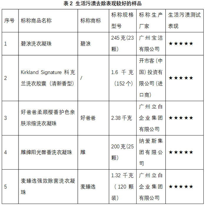 对三种规定污布(碳黑油污布、蛋白污布、皮脂污布)的去污力测试结果显示,17款洗衣液和20款洗衣凝珠表现良好,4款洗衣液样品表现较差,其中1款标称由四川蓝漂日用品有限公司生产的“蓝漂植物酵素洗衣液”对三种污布的清洁效果均不佳,表现最差。