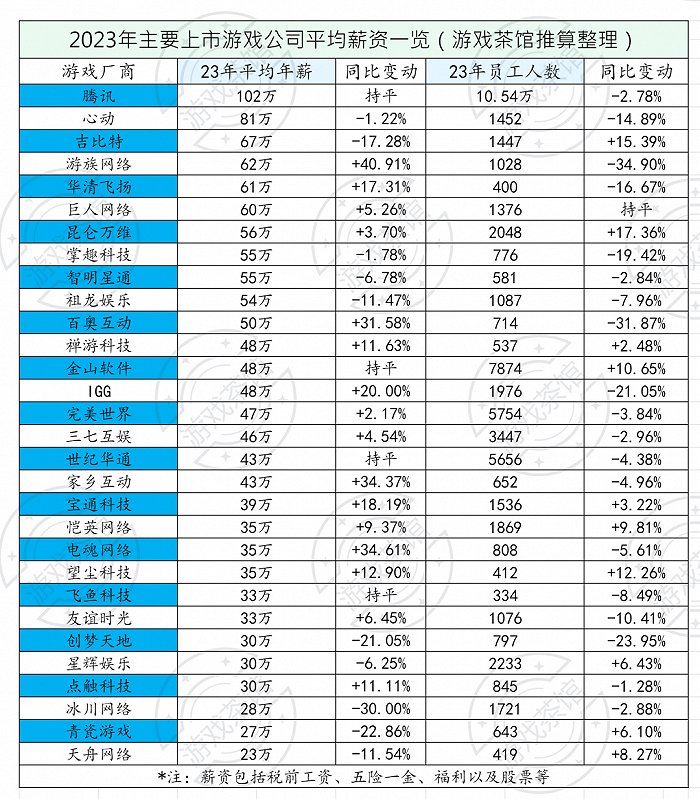 近期上市游戏厂商陆续发布2023年年报,游戏茶馆查阅了具有代表性的32家厂商年报,根据年报所披露的薪资数据,测算出平均年薪如下: